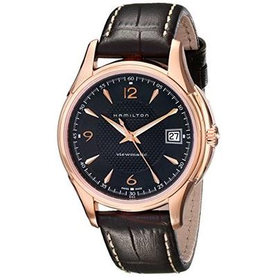 汉密尔顿 Hamilton Men's H32445585 Jassmaster Viewmatic Black Dial Goldtone Watch 爵士大师瑞士自动机械时尚男表,HAMILTON汉密尔顿是最富美国文化的代表品牌之一,一贯以粗犷、正直、大胆的美式风格为人所熟知,这款手表的表壳为不锈钢玫瑰金PVD涂层,搭配黑色表盘和棕色皮革表带,看似低调而不失锋芒。内置25石的ETA 2824-2瑞士自动机械机芯,耐刮擦蓝宝石水晶表镜。防水50米,表径37mm。