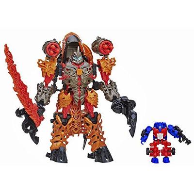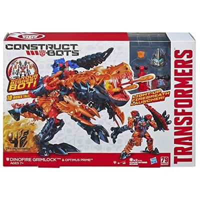 Transformers Age of Extinction Construct-Bots Dinofire Grimlock and Optimus Prime Set 变形金刚4 领袖级 擎天柱+钢索,以变形金刚电影4绝迹重生为原型,其实就是变形金钢4结尾部分擎天柱骑着钢索大反击的精彩画面,其共有79个小部件,钢索和擎天柱可以分别从恐龙、汽车状态变化成人形,还可将擎天柱放在机器恐龙身上还原电影画面,另外钢索上身还带有9枚导弹以及2枚火炮。