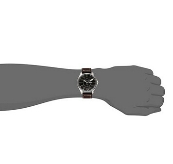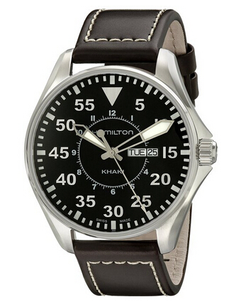 这款Hamilton Men's H64611535 Khaki King Black Dial Watch汉密尔顿男士手表型号为:H64611535,这款表是一颗石英腕表,内置一颗ETA 955.422石英机芯,走时精准,蓝宝石水晶玻璃材质制成的表镜防刮耐磨,极大延长了使用寿命,表盘上的指针和刻度都相当帅气,颇有飞行腕表的风格,三点钟方向有星期和日期显示功能,美观又方便,表带使用的是棕色真皮材质的表带,质感相当不错,表带上的走线优质,42mm圆形表盘,200米防水,就算平时下水游泳都可以。