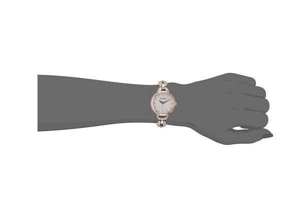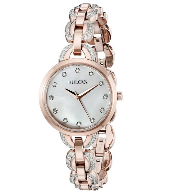 宝路华 Bulova Women's 98L207 Crystal Analog Display Quartz Rose Gold Watch 女士玫瑰金石英腕表,宝路华虽然是个美国的牌子,但是它是在瑞士组装生产的,后被西铁城集团收购,但是品牌独立运营。属于宝路华的Crystal系列,表盘表带镀玫瑰金,表壳镶嵌有数颗闪亮的水钻,珍珠母贝表盘上也镶嵌有宝石刻度,矿物水晶防刮防眩目镜面,光泽度持久,表径21毫米,30米防水,佩戴优雅有气质!
