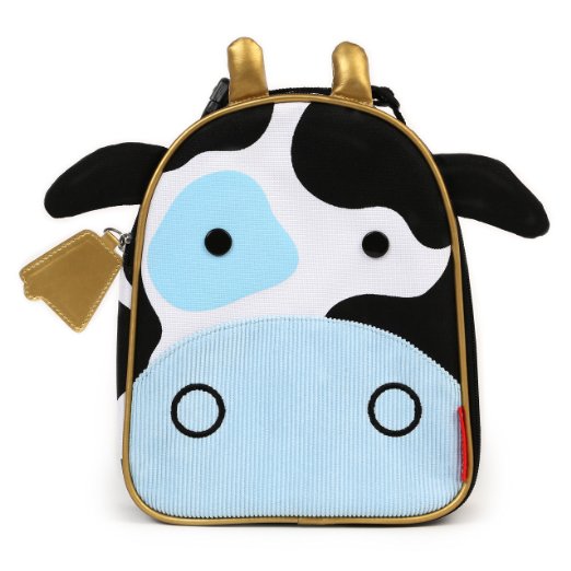 这款Skip Hop 可爱儿童动物保温午餐袋,奶牛款,温材料可以保持食物清凉新鲜,主空间大容量可放入三文治、苹果、盒装果汁等,内里设有网袋可放置餐具或者零用钱等,顶部挽手还能方便地锁到Skip Hop动物园背包或者其他包包上。