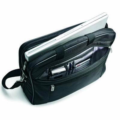 Samsonite Classic Three Gusset Lg Toploader新秀丽公文包,采用1680D弹道尼龙材料制作,外形尺寸为43x 30.5x 14厘米,可容纳17寸笔记本电脑,主仓分为三个隔层,包括一个加厚护垫电脑仓,和一个可放下A4纸张的文件仓。前部有拉链口袋可分区存放各种零碎物品,肩带有可调节软垫增强背负舒适度,另外还有一个皮包裹提手可背可提。Smartstrap可配合拉杆箱使用,方便移动差旅使用。