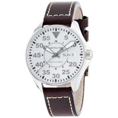 汉密尔顿 Hamilton Men's H64425555 Stainless Steel Watch with Brown Leather Band 飞行员款瑞士自动机械男表,内置一颗瑞士自动上链机芯,走时精准,每天误差时间不过数秒,棕色皮革表带,质感很不错,表带上的走线优质,38mm圆形表盘,表径大小适中,适合多数男士的手腕,白色精钢表盘,品质一流,蓝宝石水晶玻璃镜面,耐磨防刮,表盘设计上具有飞行员款的特点,仪表盘式的指针的刻度相当帅气,3点处旁边还有星期和月份显示功能,最后是50米防水,相当不错,应付日常生活防水没有问题!