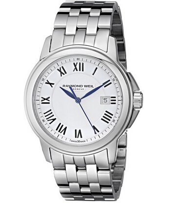 这款Raymond Weil Men's 5578-ST-00300 Swiss Quartz Movement Watch雷蒙威男士手表,型号为5578-ST-00300,采用一颗瑞士制造的石英机芯作为驱动,保证走时的精确性,蓝宝石水晶玻璃材质的表镜耐刮耐磨,极大延长使用寿命而且透光度高,不锈钢抛光材质银色外壳搭配纯白色的表盘,显得干净利落,表盘上的黑色罗马数字搭配经典的小蓝针,精致素雅。不锈钢银色表带更是显得精英,表壳直径为43mm,30米防水足够日常生活使用。