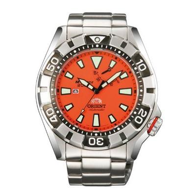 ORIENT 东方双狮 SEL03002M0M-Force 男款潜水机械表,此款M-Force系列的潜水机械表,使用不锈钢表壳跟表链,蓝宝石镜面,防水深度达200米,表盘直径为46mm,厚度13mm;拥有便于在水下较暗环境读取时刻的夜光指针和刻度,旋入式表冠能起到更好的防水作用,带有深橙色跟黑色可以旋转的两圈表盘,外表圈的分钟刻度可以用来提醒潜水时间。自动机械表芯,2点钟方向有动力储存显示,9点种方向有日期显示,拥有自动上链和手动上链等附加功能。整体外观显得大气稳重。