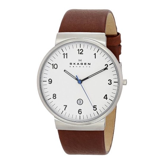这款Skagen Men's SKW6082 Ancher Stainless Steel Watch with Brown Leather Band斯卡恩男士石英腕表型号为:SKW6082,采用一颗石英机芯驱动,保证走时的精确性,表镜采用了矿物水晶材质制成,防刮耐磨,极大延长使用寿命,银色不锈钢表壳搭配白色简洁的表盘营造出一股简约时尚的北欧风范,这款表6点钟方向有一个原型小开窗可以显示日期,方便实用,棕色高级牛皮表带质感突出,又能很好地搭配北欧风的感觉。这款表表盘直径为40mm,防水为标配的30米防水,足够应对日常生活。