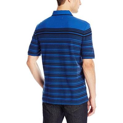 美国企鹅万星威 Original Penguin Engineered Two-Color 士条纹polo衫,修身版型,三扣,面料是100%纯棉,柔软舒适,衣面是以蓝色为底,黑色条纹搭配,款式好看,左胸口还有一个口袋,并绣有企鹅的品牌Logo。
