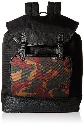 Fred Perry Nylon Rucksack男士休闲双肩包,包正面右下角印有银色月桂树标志,采用尼龙材质,结实耐磨,顶端翻盖搭扣开口,迷彩拼接造型时尚百搭。主袋内有一个拉链安全口袋,外形尺寸为40*30*6.5cm,容量非常充足,可装下较大笔记本以及诸多杂物,商务通勤或者短途出行都适用。
