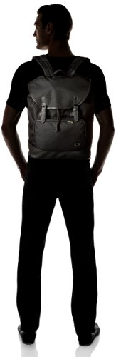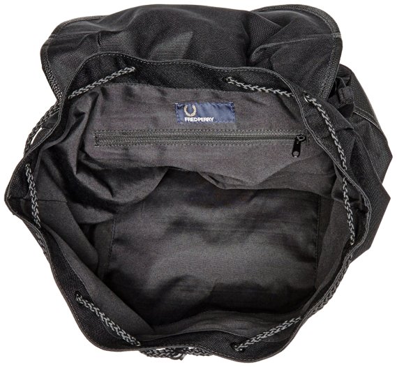Fred Perry Nylon Rucksack男士休闲双肩包,包正面右下角印有银色月桂树标志,采用尼龙材质,结实耐磨,顶端翻盖搭扣开口,酷黑造型时尚百搭。主袋内有一个拉链安全口袋,外形尺寸为40*30*6.5cm,容量非常充足,可装下较大笔记本以及诸多杂物,商务通勤或者短途出行都适用。