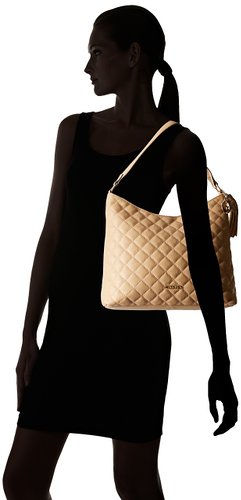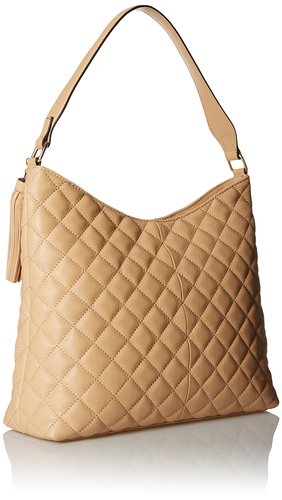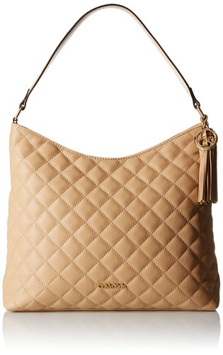 这款Calvin Klein Quilted Leather Hobo 女士真皮单肩包,采用优质真皮材质,菱格纹缝线装饰,正面下方低调LOGO,呼应肩带处的金属LOGO和流苏吊饰,顶部拉链开合,内里有单独的拉链壁包,简洁大方,尺寸约25.4*31.75cm。