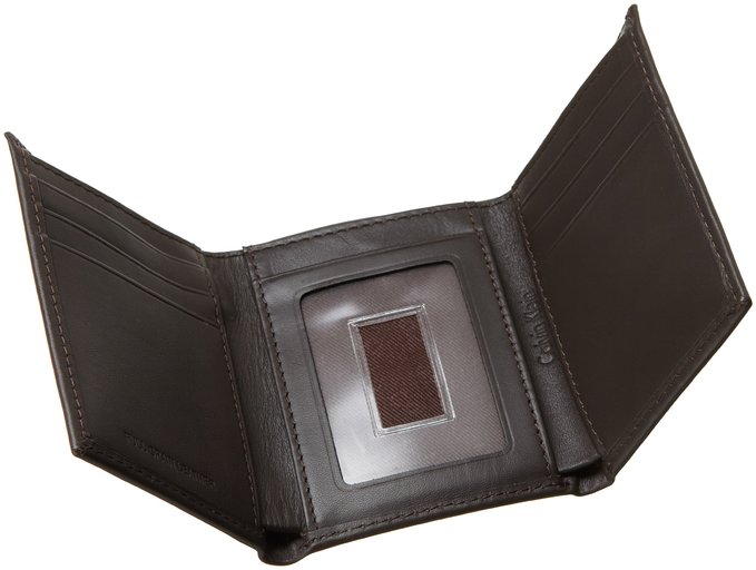 这款Calvin Klein Men's Leather Trifold男款三折真皮钱包,采用柔软的真皮制成,触感舒适。三折式设计,做工精细。钱包设有票据位、大钞位,8个信用卡位,一个透明证件位。包装内赠钥匙扣一枚,很是实用!