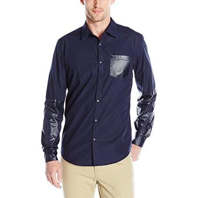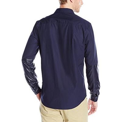 这款CK Long-Sleeve Nylon Block 男士长袖衬衫,标准版形,面料是100纯棉,穿起来舒适透气,采用亮面尼龙拼接袖子和前口袋,纯色系的衬衫,穿着稳重,同时袖口搭配拼接的亮面尼龙,带来一丝潮人气息。