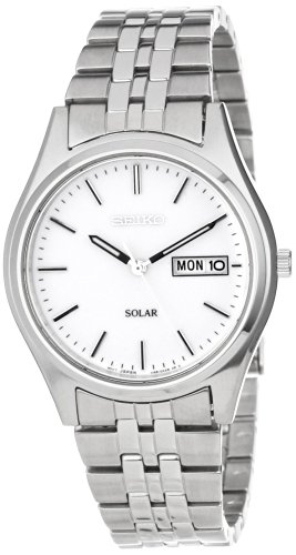 SEIKO精工男款光动能石英腕表SNE031,采用精工光动能石英机芯,保证了时间的精确,通过可见光为内置充电电池充电,充满电可以连续使用6个月。尊贵优雅,气质非凡,防刮耐磨矿物玻璃表镜下为白色表盘,表盘上镶有黑色全时刻度,边缘精确到秒,3点钟方向为日历显示窗,夜光指针方便夜间读取,钢化玻璃镜面,耐磨透亮,带有银色金属质感的抛光不锈钢表壳,表壳直径37毫米,大小适中,方便佩戴,表壳厚10毫米,30米防水也足够日常实用了。