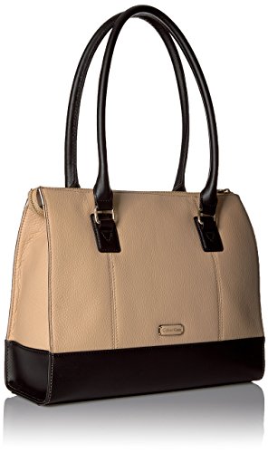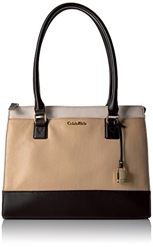 Calvin Klein Modena Color Block 女款真皮手提包,采用荔枝纹真皮材质,包型质朴方正,顶部拉链开合,内设功能性壁包,金属锁头挂饰,手柄较长,可肩背可手提,尺寸约合28*33cm,非常适合通勤等正式场合使用。
