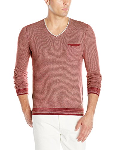 BOSS Orange Men's Kerpen Lightweight Merino-Blend V-Neck Sweater 橙标 男士美利奴羊毛混纺针织衫,含50%棉+30%锦纶+20%美利奴羊毛混纺而成,保证羊毛保暖性的同时也容易打理,具有良好的弹性,极具特色的条纹外观搭配抢眼的V领线条,保暖又百搭。可内搭衬衫或打底衫,简约又有型,春秋冬季均可穿着。