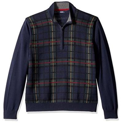 这款IZOD 男士1/4拉链长袖毛衣采用100%纯棉材质,上身柔软舒适,同时保暖效果不错。深色格子设计,纯色袖子拼接,款式低调简约,上身好看。1/4领拉链设计,可机洗。