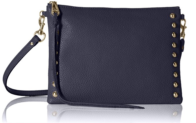 Rebecca Minkoff 瑞贝卡·明可弗 Jon with Studs 女士真皮斜挎包 采用100%优质牛皮材质,皮质细腻柔软,荔枝纹的表面也很经典。顶端拉链开合,使用很方便。两边有铆钉装饰,给包包增添一分帅气。肩带可卸可调节,肩带卸去后还可以当手拿包用。尺寸约为25x18cm。