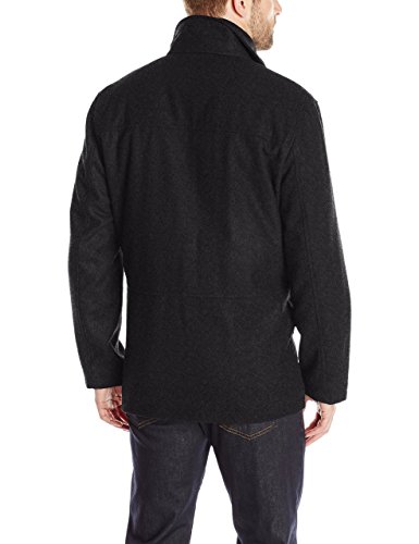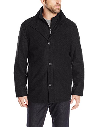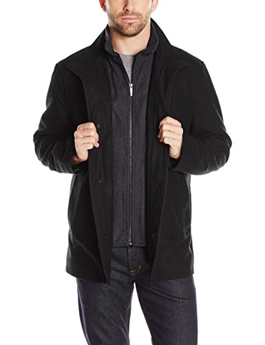 London Fog Men's Wool Blend Car Coat with Bib伦敦雾 男士羊毛混纺长大衣,采用60%羊毛+30%聚酯和10%人造丝混纺而成,在发挥羊毛保暖性的同时,也增强了衣服的耐磨抗皱性和版型的合身度。内部带拉链织物立领风挡,假两件的设计,增强前胸保暖度,且更加时尚美观。沿袭了London Fog简洁大方的风格,外部小V领,单排圆扣设计,带两个插手袋,沉稳大气又保暖。