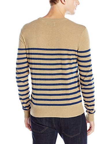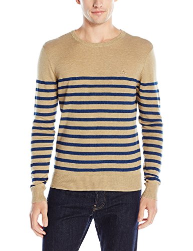 这款企鹅Original Penguin Pima 男士圆领针织衫,修身版型,采用100%棉质针织面料,柔软亲肤,穿着舒适透气,衣面是以卡其色打底,搭配墨蓝色条纹。胸前品牌logo刺绣,彰显品牌魅力,圆领设计,简约大方,适合日常休闲穿着。