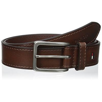 汤米希格菲尔Tommy Hilfiger Men's 35mm Vegatable Leather Belt 男士皮带,这款腰带并非真皮材质,采用涤纶纤维仿皮材质,在质感上没有真皮皮带那么出色,但是优点就是更加方便打理清洁,不怎么容易弄脏,相应的价格也便宜了不少。采用压裁线边缘设计,走线工整,凸显工艺的细致。银色金属皮带搭扣,与深棕色皮带一起带来了浓浓的复古味道,皮带搭扣旁边还印有彩色的汤米LOGO,彰显品牌魅力。这款皮带走的是一个休闲风格,宽度为35mm,比较细,作为一款时尚配饰来说已经相当合格了!