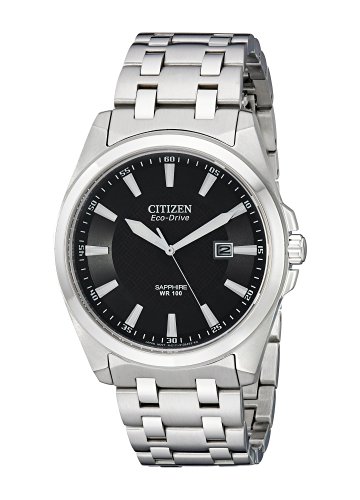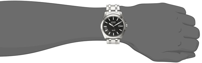 这款Citizen 西铁城男士腕表型号是BM7100-59E,银黑配色十分硬朗,内置Eco-Drive光动能机芯,蓝宝石抗反射防刮擦表镜,黑色表盘,银色指针及刻度,带夜光显示,3点钟方向显示日期,表壳直径42mm,厚约10mm,表带宽22mm,拉丝处理表链用抛光不锈钢活结连接,双按式三折扣表扣,100m防水。