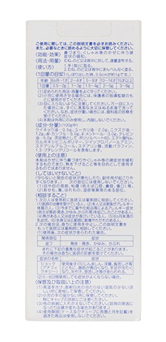 其成分为茴香油0.5克,桉树油2.0克,肉豆蔻油1.2克,DL-樟脑5.0克,1-薄荷醇3.0克,松节油5.0克,聚山梨醇酯60作为添加剂,依地钠,羧基乙烯基聚合物,二异丙醇胺,硬脂醇,硬脂酸,液体石蜡,1,3-丁二醇。使用方法:将本品涂抹在宝宝胸前,稍加按摩,待其挥发,给宝宝带来神清气爽、呼吸畅通的感觉。使用时要远离眼睛及眼睛周围部位,伤口、口腔、鼻腔等粘膜处。痱子、肿胀部位、湿疹等异常部位也要远离。