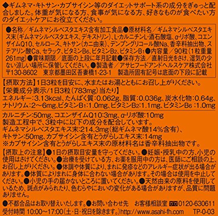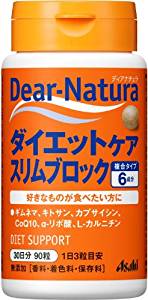 这款ASAHI 朝日 Dear-Natura 饮食防护片,主要成分包括强化α-硫酸锌,壳聚糖,匙羹藤,左旋肉碱和辣椒素,以及丰富的维生素B群。其中比较值得一提的是匙羹藤,古印度阿育吠陀医经(Ayurveda Medicine)就记载咀嚼该植物的叶子可以破坏糖的甜味,因此称它为"糖分破坏者"。匙羹藤破坏糖分,左旋肉碱将脂肪转化为热量,而辣椒素和维生素B群负责燃烧和代谢热量,6种成分综合作用能够很好地帮助加强代谢,减少热量吸收,对于喜欢甜食和油腻食品的人有比较好的控制热量的辅助作用。用法用量:每日1次,每次3粒。