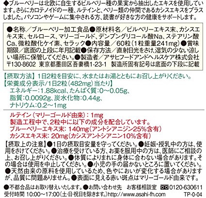 ASAHI 朝日 DEAR-NATURA 蓝莓 叶黄素 护眼胶囊,原材料成分:蓝莓、黑加仑、纤维素、金盏花、羧甲基淀粉钠、硬脂酸钙、纳米二氧化硅、紫胶。除了含有大家都知道的眼部保健必须的叶黄素外,还有抗氧化非常厉害的蓝莓成分!将蓝莓和叶黄素的护眼效果强强联合,不含香料、色素或防腐剂,为学生及电脑办公族提供充分的健康保障。