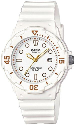这款CASIO卡西欧女士计时腕表LRW-200H-7E2JF是2015发售款式, 混然一体的纯白色表壳表带,白色表盘点缀的圆形+方形刻度和指针,表背为不锈钢 ,橡胶表带 ,镜面为矿物玻璃镜面,直径为34.2mm,厚度为11.5mm,表带长12.5-18cm,生活防水用强化防水100米,带有日期显示功能,可旋转表圈。