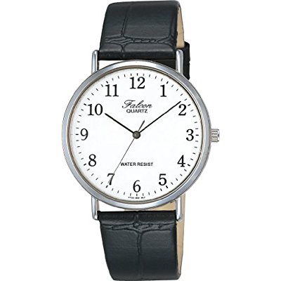 CITIZEN 西铁城 Falcon 猎鹰 V722-850 男款时装表,型号为V722-850,石英机芯,简约典雅,表径34mm,厚度7mm,白色表盘,矿物玻璃表镜,黑色皮革表带,整体色调清新高雅,生活防水30米。