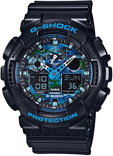 这款G-SHOCK GA-100CB-1AJF是卡西欧在2016年推出的产品,采用合成树脂表盘,支持指针和数显显示,表盘直径5.1cm,表盘厚度16.9mm,表带宽度22mm。支持全自动日历,日期、星期显示,同时具有世界时间、闹钟、LED灯功能。加强20BAR防水,耐冲击构造,整体重量约73g。蓝色和黑色的组合表盘元素,主色调黑色的基础上由蓝色进行填充及边框点缀,同时加入了迷彩元素使得颜色并不那么单调。