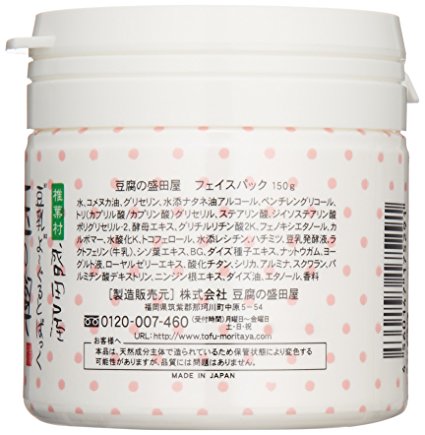 豆腐盛田屋 豆腐面膜(150g)【豆腐の盛田屋ヨーグルトパック 150g】,这款盛田屋豆腐面膜,容量为150g,原料采用日本原产大豆和宫崎县椎叶村泉水、大豆和泉水酿出浓厚豆乳,含有被誉为美人元素的异黄酮,除此之外还添加了具有抗氧化能力的蜂皇浆,能够淡化色素的蜂蜜,促进角质死皮脱落的酸奶,紧致毛孔的紫苏精华和保湿能力强大的维生素E;质地粘稠,补水效果不错,每次涂抹后仅需等10分钟左右冲洗掉,皮肤马上变得水嫩光滑,配合按摩效果更佳;另外这款面膜不含香料等刺激性化学原料,敏感肌肤也可放心使用。