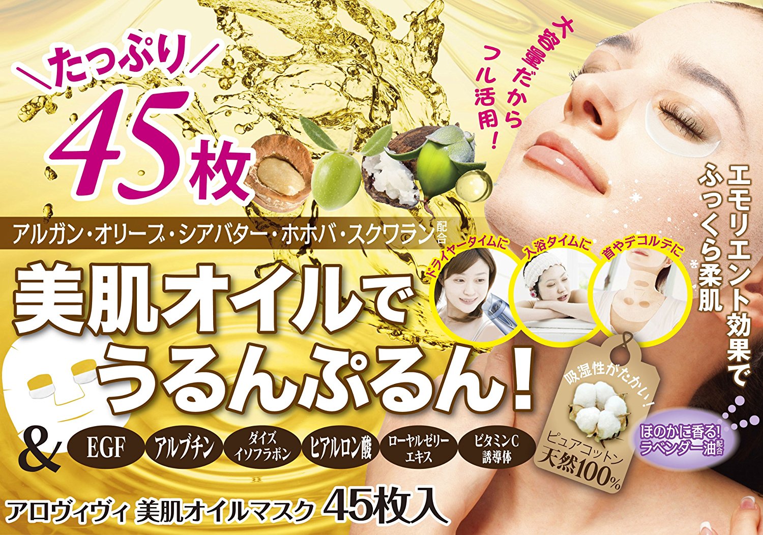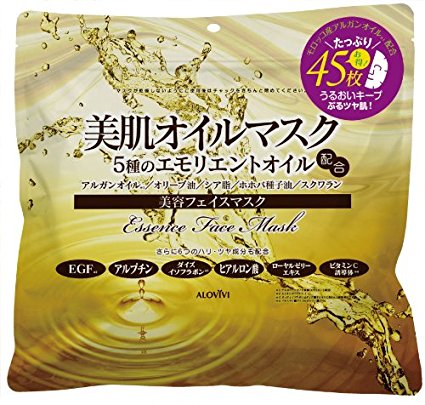 ALOVIVI美肌精华油面膜45枚5种植物精华精油+6种美容成份无合成香料、无着色、无矿物油优势:本品以植物提取精华油,添加了一般面膜没有的摩洛哥坚果油、橄榄油、角鲨烷等五种美肌油成分,恢复弹力光泽、补水保湿,适合想嫩肤、滋润干燥肌肤的朋友。ALOVIVI 45枚装大容量的系列面膜在商场货架上一直是摆在非常醒目的位置,是日本化妆品购物网站人气商品!45P/袋天天用都不心疼,还环保。早晚一片不仅有利于上妆,更可以给你一天好气色。