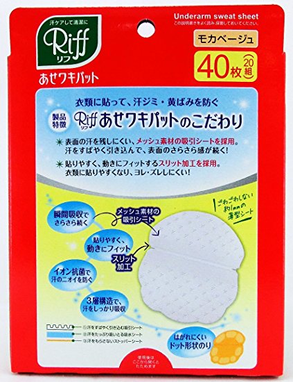 小林制药 Riff 腋下专用轻薄舒适止汗贴,吸汗垫的厚度仅为1mm,3层吸水构造、充分吸汗、腋下保持清爽舒适;凹凸表面的吸汗垫即使使用一整天也能保持松软清爽;点状黏贴剂、紧密服贴、不易脱落,而且取下时也不会伤害衣服;在消臭(酸化亚铅)离子的作用下,持续一整天有效抑制汗味。仅需贴于衣物的腋下部位即可。