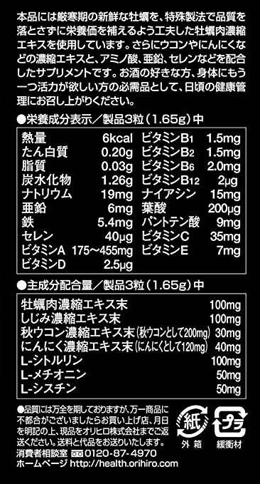 这款快活宣言是ORIHIRO 立喜乐牡蛎精华系列产品中的精品,原料为营养丰富、无任何污染的日本濑户内海国产100%新鲜牡蛎,并配合日本国产的秋姜黄,蚬子,大蒜,氨基酸,锌、硒矿物质微量元素,维他命B群等营养成分提炼而成。具有护肝补肾,提高性活力;防衰老,抗癌抗肿瘤;降血脂,促进血液循环等功效,是饮酒爱好者以及想提高身体性活力男士理想的滋补佳品!