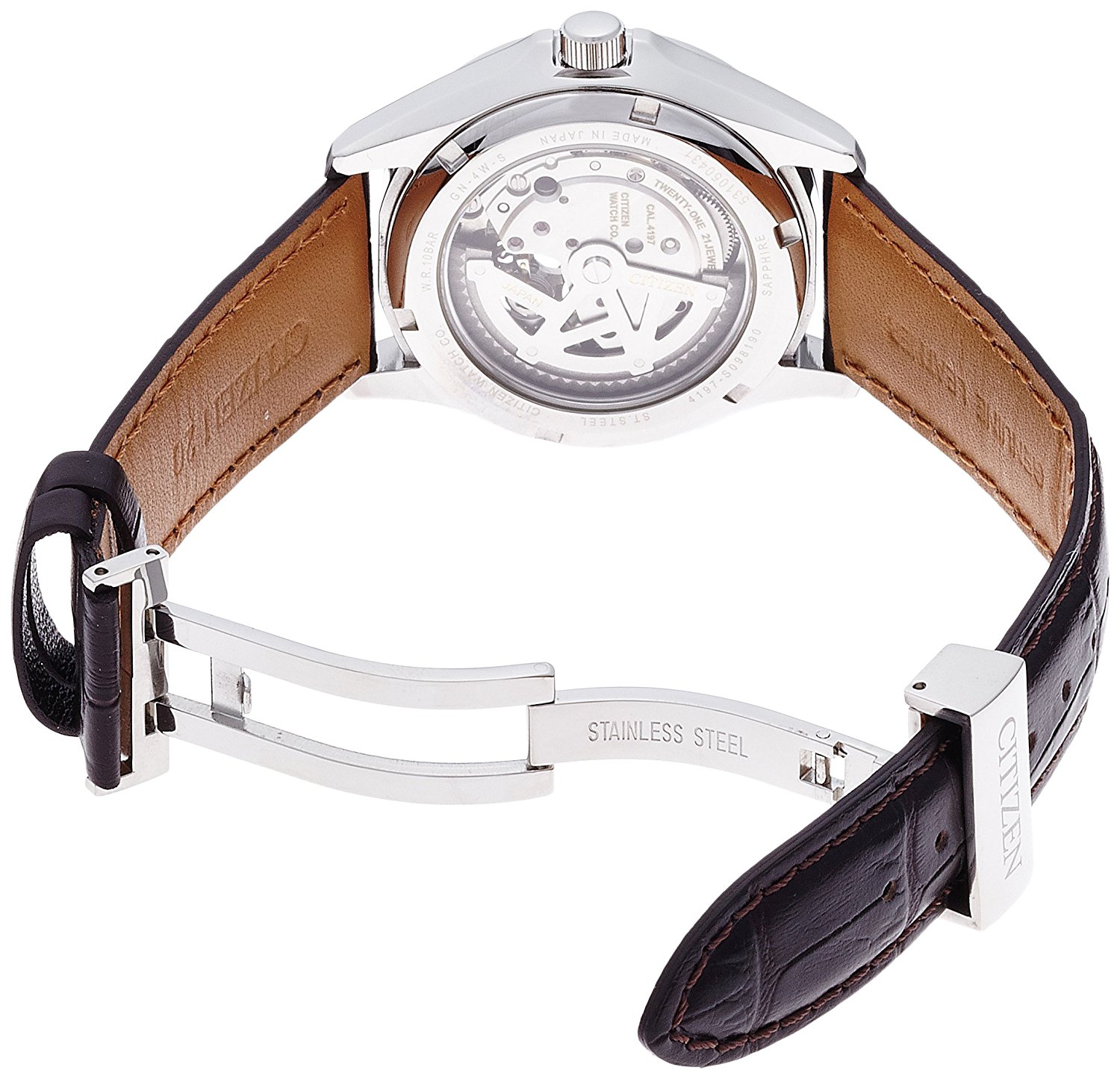 这款[シチズン]CITIZEN 腕時計 CITIZEN-Collection シチズンコレクション メカニカル 日本製 シースルーバック NP1010-01A メンズ 西铁城男士腕表,型号为:NP1010-01A,它采用了一颗机械机芯驱动,逼格高,走时准,蓝宝石玻璃材质的表镜防刮耐磨,透光度好,不锈钢材质的表壳搭配棕色皮质表带显得质感十足,银白色的表盘正面背面都有镂空设计,可以看到机械机芯的运动,100米的防水足够日常生活使用。