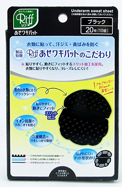 日本小林制药腋下吸汗除臭贴,专为女士设计,可以防止腋下汗渍,舒适不留痕迹。它具有透气棉质的保护垫,吸水性强、触感柔软,抛弃式的保护垫使用便利,炎热季节的秘密武器哟。止汗贴是曲线形状,可牢固粘贴于衣服上,配合有消臭成分,无香味。有效防止腋下汗臭长达十小时.纯天然植物制成不会引至敏感。 请在未穿著前,贴上使用。先撕去A的纱纸,将折合线对淮袖口,紧贴上即可,注意不能外露.尽量贴在衣服之内侧,由于前腋容易出汗,尽量 将吸汗贴向前方2-3CM左右处位置贴好,便可充分吸汗,一片约可持续3-6小时的干爽与舒适。 注意卫生,每用一次即更换新垫片为宜。
