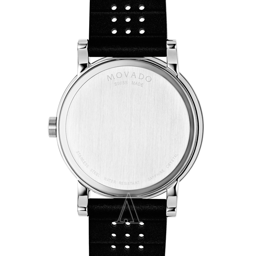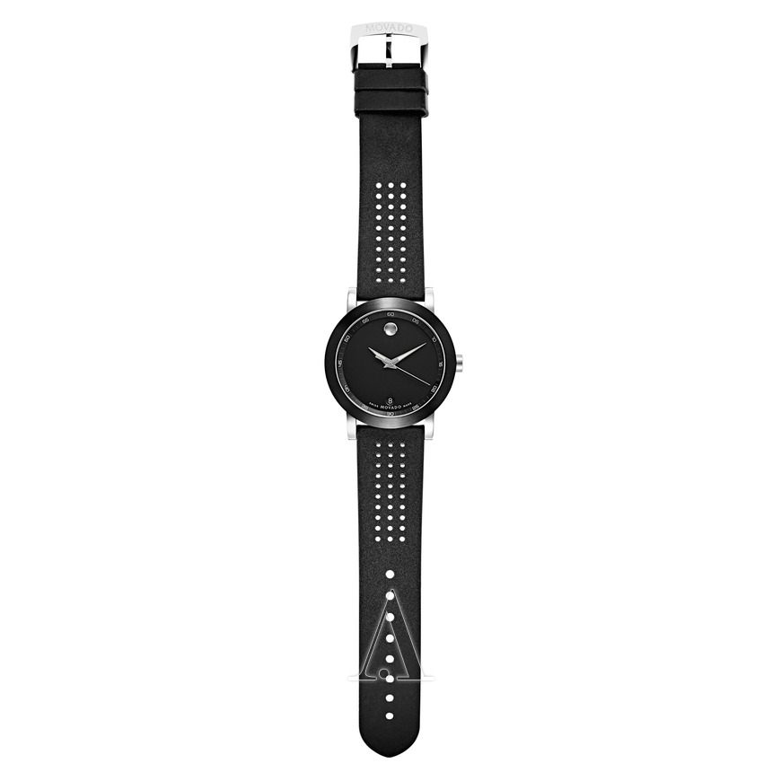 这款MOVADO Museum Sport 0606507 男款时装腕表,黑色PVD涂层不锈钢表壳,三大针黑色博物馆表盘修饰以银色凹面圆点日期显示,表镜为蓝宝石水晶玻璃,黑色打孔橡胶表带,瑞士石英机芯。表径是42.5mm,厚度9mm,防水30米。