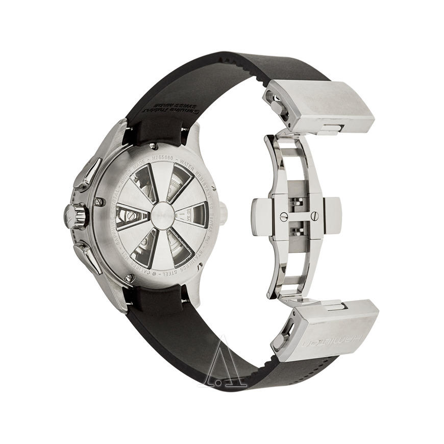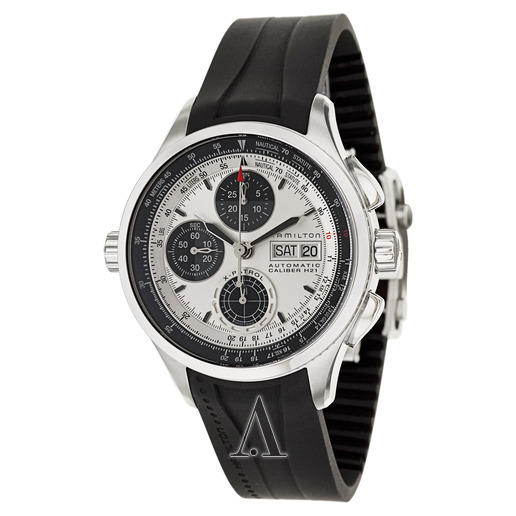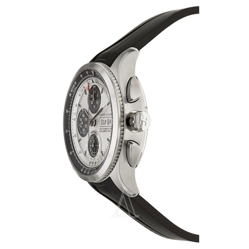 这款汉密尔顿以H-21抗硬风格机芯和轮毂式背透设计而独树一帜。采用25颗轴承的ETA H-21自动机械机芯,该机芯以ETA 7750机芯为基础打磨而成,将动力储备提高至60小时,走时更加精准。银色表盘搭配经典黑色三个独特子表盘,刻度精密独特,三点钟处双日历窗,银色夜光指针;轮毂式背透设计,可欣赏机芯律动;抛光不锈钢表壳配黑色橡胶表带,表壳直径42mm,100米防水。