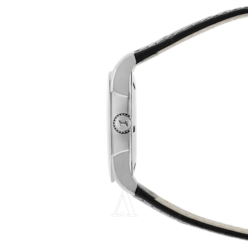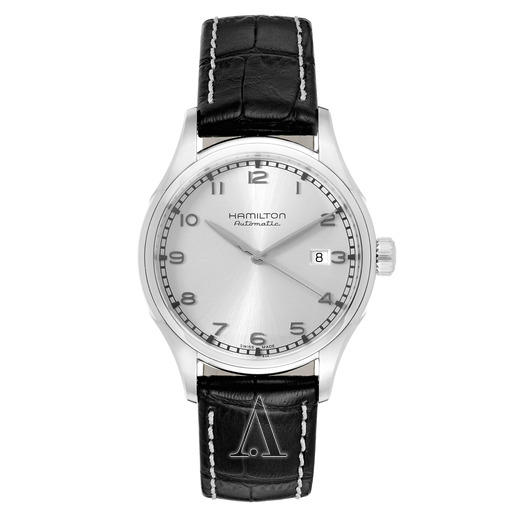 这款Hamilton American Classic Valiant Auto Men's Watch汉密尔顿男士机械腕表,属于永恒经典勇者系列,编号为H39515753,采用可靠的ETA2824-2机芯,25钻,振频28,800次/小时,可存储动能38小时。不锈钢表盘直径40mm,厚度10mm,银色表盘搭配灰色指针和黑色阿拉伯数字时标,3点位置日期显示,蓝宝石水晶防划表镜,黑色真皮表带,防水50米。