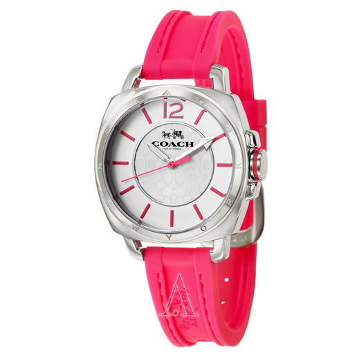 这款COACH 蔻驰 Boyfriend系列 女士时装腕表 14502151,采用日本石英机芯,矿物水晶镜面,印有品牌logo的银白色表盘搭配粉色硅胶表带,外观养眼,佩戴也舒适。表径34mm,厚度10mm,防水30米,款式简约,很好搭配服装。