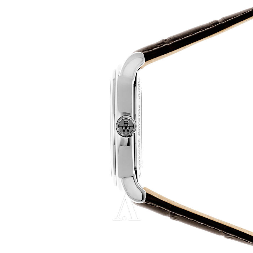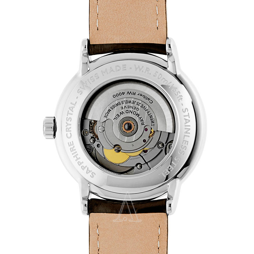 这款RAYMOND WEIL 蕾蒙威2837-SL5-65001男款机械表 ,大师系列,RW4200自动上链机芯,25颗红宝石,38小时动力储备;银色不锈钢表圈棕色牛皮表带,巴黎钉纹表面上有玫瑰金色指针和时刻;防刮擦蓝宝石水晶镜面;3点钟方向显示日期;表径39mm,厚10mm,50米防水。