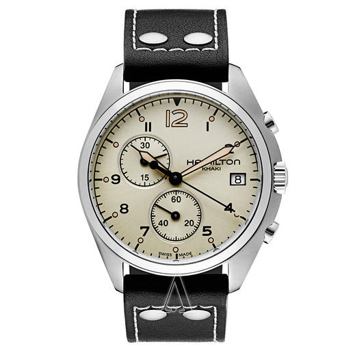 这款Hamilton H76512755瑞士石英男表,属于汉米尔顿卡其航空系列,采用瑞士石英机芯,蓝宝石水晶防划防眩表镜,抛光不锈钢表壳,米色表盘配黑色真皮表带,夜光指针和阿拉伯数字时标,两个时尚子表盘,3点处日期显示;表壳直径41毫米,防水系数100米。整体设计非常简洁大气!