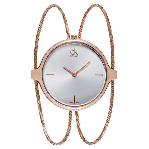 Calvin Klein Agile 系列 女士时装腕表 K2Z2M616,表盘依旧保留CK极简风格,2条手链式的玫瑰金表带纤细轻盈,更显女性优雅气质。手镯装的手表,集美观和实用性为一体,装饰性十足,喜欢独特造型设计的妹纸们不要错过采用玫瑰金色表壳,搭配放射状银白色表盘,时尚靓丽,配上精致小巧的玫瑰金色短两针指针、条形时标和CK logo,颜值非常高。采用瑞士石英机芯,推拉式表冠,表盘直径约为37mm,厚度7mm,矿物水晶镜面,防水30米,满足日常生活需要。