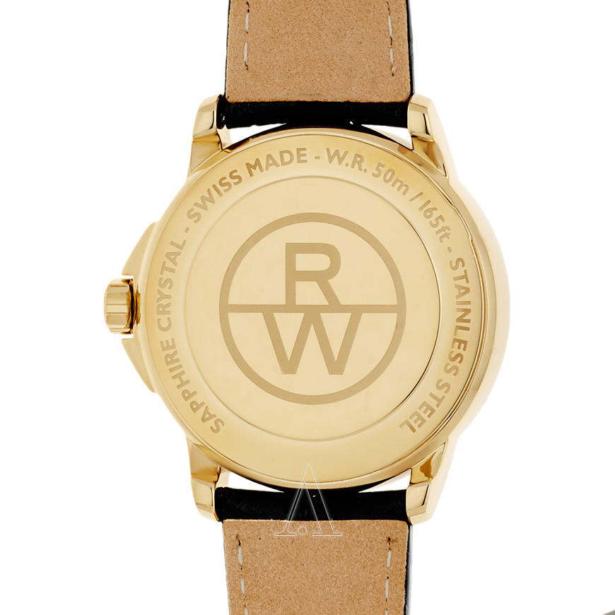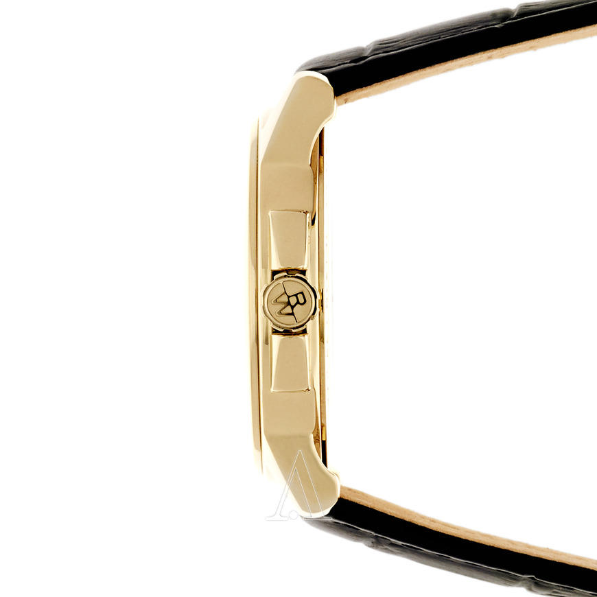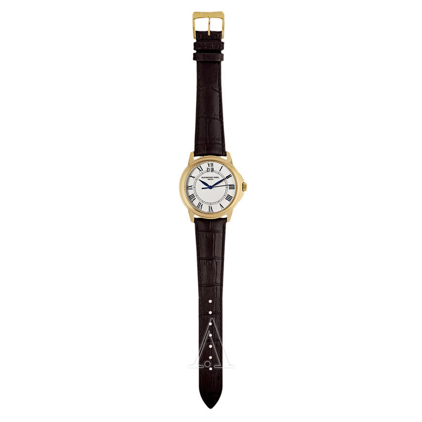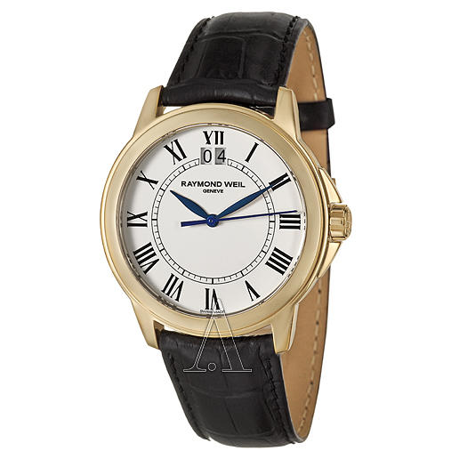 这款型号5476-P-00300的Raymond Weil雷蒙威Tradition系列男表,采用瑞士石英机芯,镀金色表壳搭配黑色真皮表带,38mm表径的表盘上,配有罗马数字时标和树叶状三针指针,12点钟位置显示日期,款式沉稳大气。