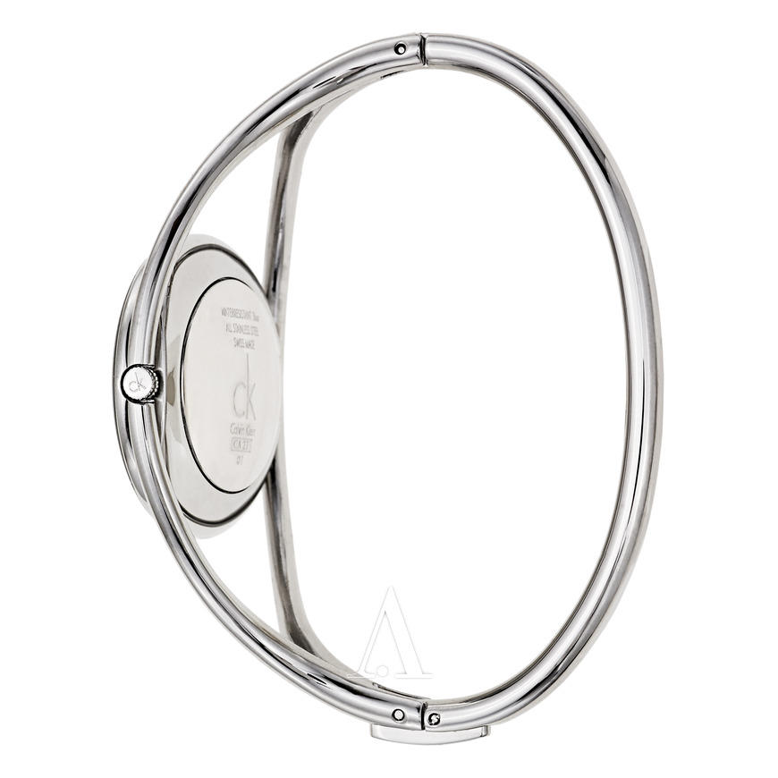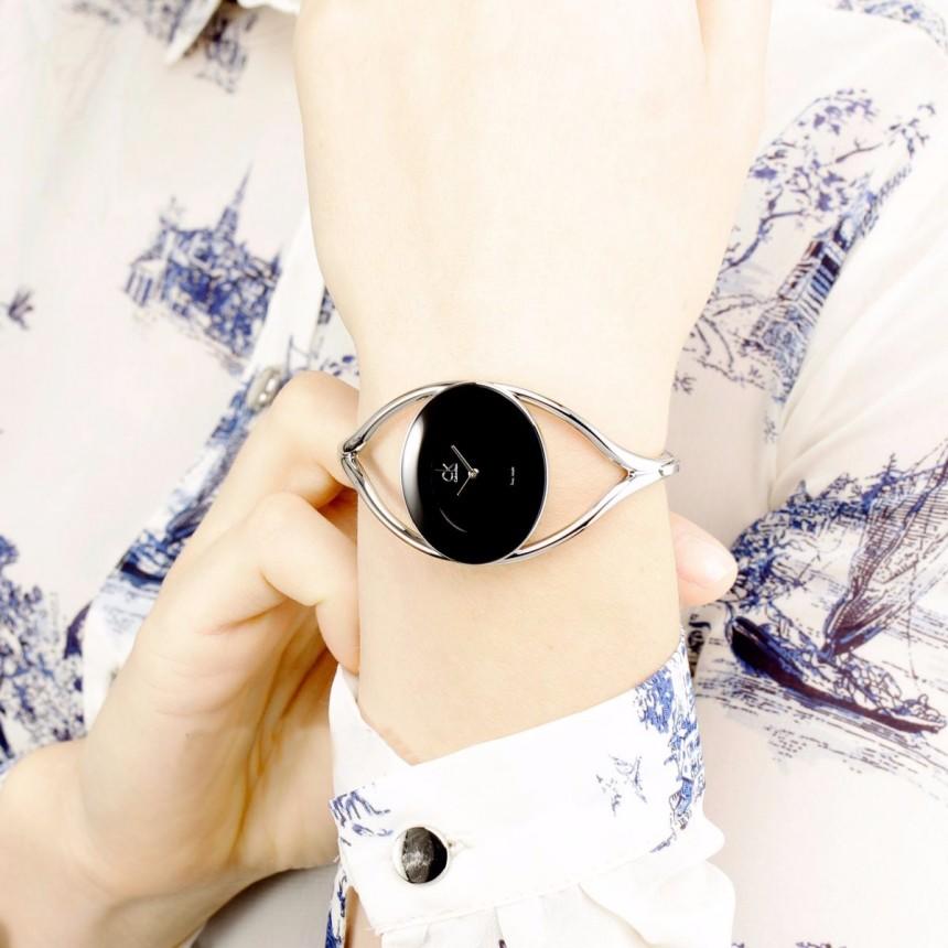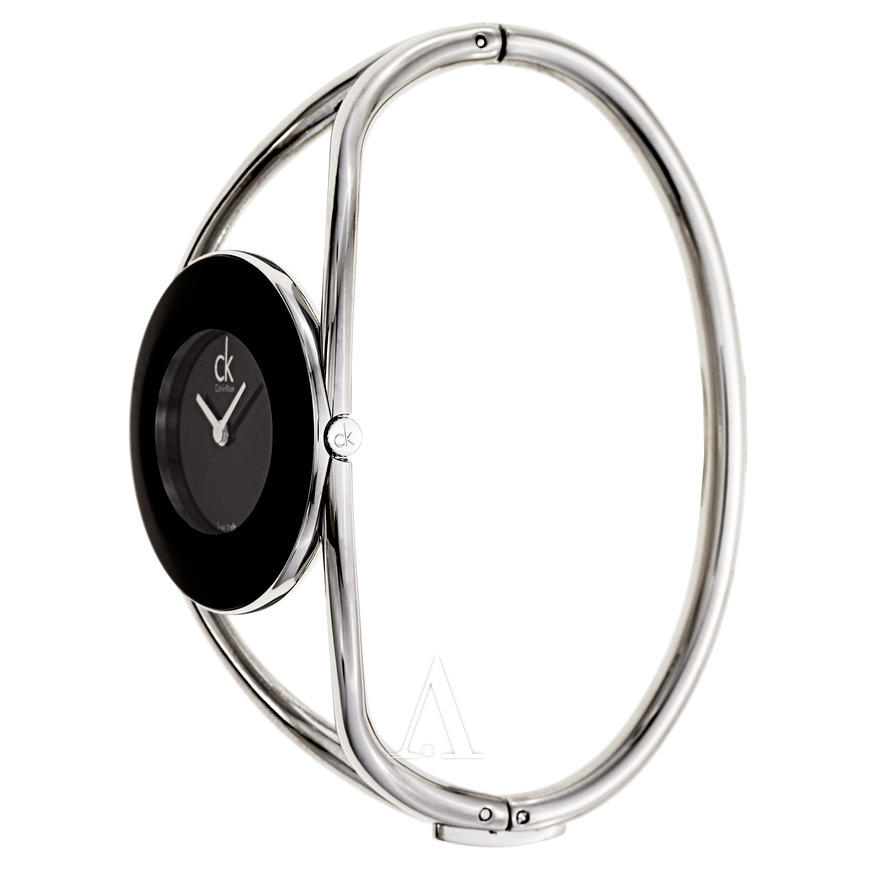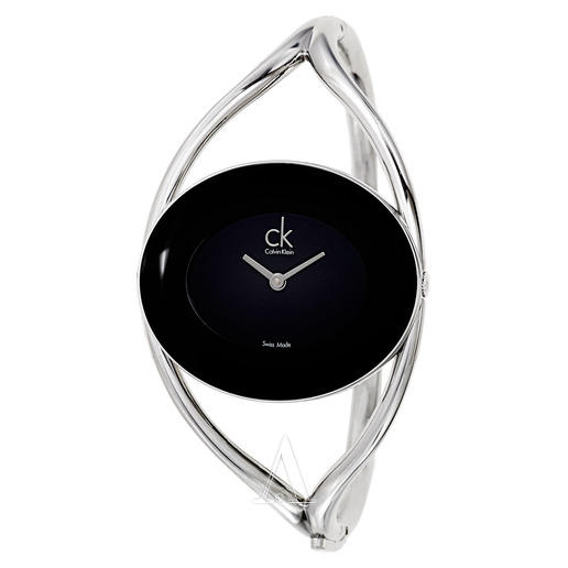 这款型号K1A23102的镯式腕表,来自Calvin Klein Delight系列,出产于瑞士。银白色手镯式表链设计,纤细优雅,搭配大片留白的纯黑色表盘,非常时尚有气质。表盘上简洁展示银色短两针指针和CK logo,简单明了。