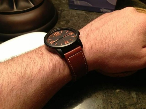 这款编号BM8475-26E,德味的哑光炭黑色表盘,特色而精致,夜光橙色指针和数字刻度,骚气袭人。机芯也是西铁城引以为豪的Eco-Drive光动能石英机芯,表盘直径42mm,厚度11mm,3点钟方向带有星期和日历双显,真皮表带,防水达到100米。