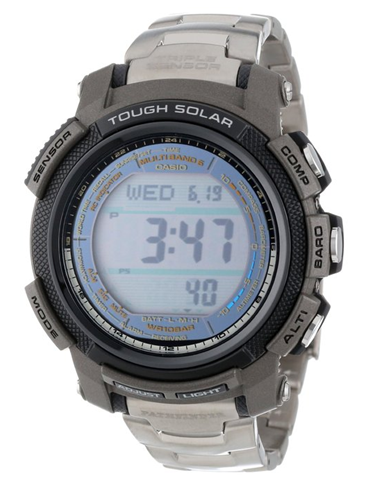 CASIO PAW2000T-7CR太阳能钛合金六局电波多功能登山表(国内对应型号PRW-2000T-7D),是卡西欧登山系列(国行叫PROTREK,美行叫Pathfinder)最高端的型号,采用50mm直径 钛金属表壳和表带,非常轻而且不刺激皮肤。11.3mm的超薄外型,防水100m; 可接收全球6局电波,包括国内商丘站信号,达到“分秒不差”的精确走时。太阳能驱动电力系统、即使在微弱的日光灯下也能发挥充电功能,保证手表大多数功能的运行。双重液晶显示,还拥有带卡西欧当家技术三重感应器:罗盘功能、高度和气压测量功能、温度测量功能,其他功能有31时区(48城市)、城市代码显示、日光节约时间、城市代码显示、日出/日落时间显示、5组独立闹铃、全自动日历、夜间显示等功能。