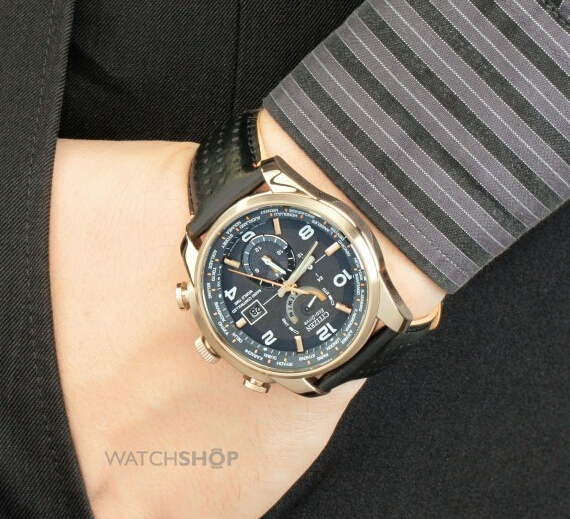 这款型号为AT9013-03H的Citizen 西铁城光动能万年历男表,采用的就是H820机芯,灰色表盘上集合了众多功能,包括12点方向的星期显示(带SMT夏令时开关),3点钟方向的日历显示,6点钟方向的本地时间,9点钟方向的24小时计时,以及遍布表圈的26地世界时间。带电波校时,可接收全球5局电波(日本福岛和九州、美国、德国、中国),达到分秒不差的精确走时。吸收日常可见光作为能量来源,无需更换电池,充满后正常使用6个月,节能模式下8个月,玫瑰金表壳,表盘直径43mm,厚度13.5mm,黑色真皮表带,耐磨抗反射蓝宝石镜面,防水200米。