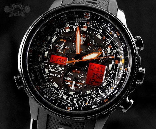 超级空中之鹰系列是CITIZEN西铁城的高端系列,大陆行货空中之鹰系列定价在¥1.2W~1.5W之间。JY8035-04E西铁城光动能5局电波男表,是空中之鹰系列2013年新款,表壳和表盘均使用离子镀黑处理,表盘直径48mm,采用顶级Eco-Drive U680光动能电波机芯,特点是可接收全球5局电波,包括国内秋波(中、日、德、英、美),每天凌晨2点及4点自动接收电波校时,10万年仅一秒误差的超高精确度。可吸收日常可见光作为能量来源,一次充满后可以使用时间长达180天,其他功能包括世界时间(43个城市)、万年历、指针数字双显、日历、星期、12/24小时显示、数字照明、2组闹铃、1/100秒秒表(计时范围24小时)、旋转计算尺边框、航空标尺、倒计时、剩余电量显示等,黑色橡胶表带,耐磨抗反射矿物玻璃表镜,防水深度200米。。美国亚马逊(下单教程)特价后下单自动九折,然后用码SUMERSAV实付$327.6,到手约¥2100(不含税)